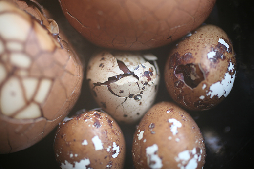 The method remains the same as above. This is a sweet version of the savory traditional tea egg. The small eggs in these photos are quail eggs, which are incredibly good as tea eggs, because you can eat them whole [peeled, of course]. Mmmf!