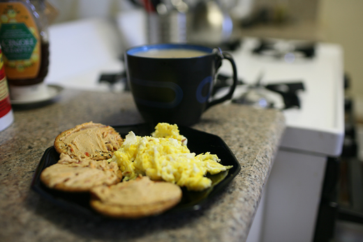 Milk tea, eggs scrambled with sesame oil, anise crackers with chipotle hummus.