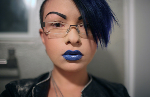 Below, I gothed it up and lined my lips with black, going over it in with a mix of fuchsia lipstick, gloss, and Sugarpill’s Hysteric loose shimmery eye shadow. Modeled in my finest sock monkey pajamas before and after several hours out with no touch-ups.